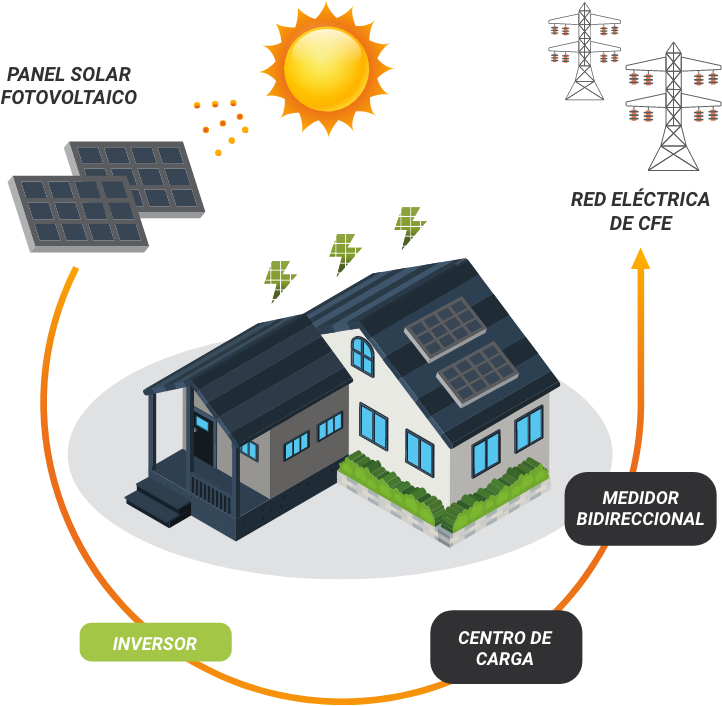 Los paneles solares constan de un arreglo fotovoltaico, es decir que la energía solar es recolectada por los paneles solares, para después pasar por un inversor, el cuál convierte la energía solar en la energía eléctrica. Al pasar la energía por el inversor, ésta es conducida hacia el medidor bidireccional (puede ser directo o por medio de la caja de fusibles) la cual envía la energía eléctrica hacia la casa o establecimiento que se busque abastecer.
